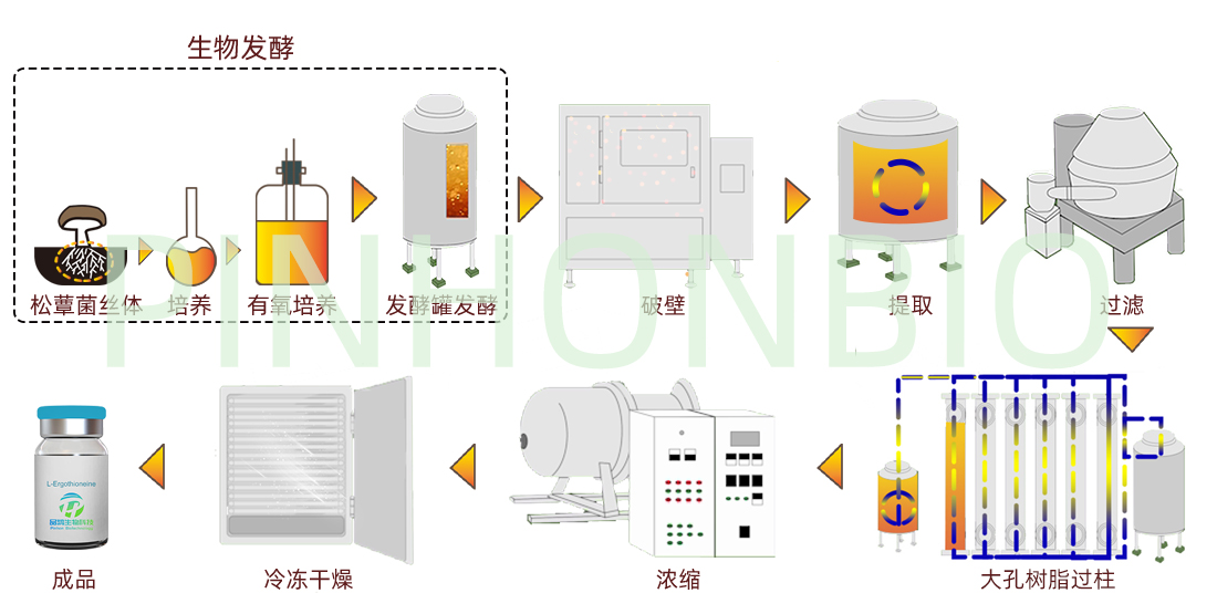 提取法是从食用菌的子实体、猪血、动物组织、麦角和谷物中提取麦角硫因,但上述原料中麦角硫因的含量仍然很低,且存在原料的杂质多,药物残留(菌菇类很容易农残超标,在培育的过程或者野生的重金属容易超),提取成本高及民族禁忌等问题。许多大型真菌具有合成麦角硫因的能力,但其子实体中麦角硫因的含量低,从大型真菌的子实体中提取麦角硫因的成本高。