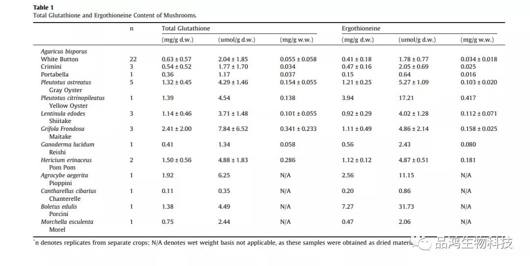 麦角硫因(ergothioneine,ERT)学名为 2-巯基-组氨酸-三甲基内盐,摩尔质量为229.3,是一种无色无味的天然氨基酸。1909 年,Tanret C首次从麦 角(寄生在禾本科植物黑麦上的一种真菌所成的菌核)中分离得到麦角硫因。麦角硫 因主要存在于一些细菌和真菌中,不能由动物机体自身合成。人 体自身也不能合成麦角硫因,但是当食入含有麦角硫有的食物特别是食用菌和肉类 后,人体血液中麦角硫因水平显示增加,其存在于人的大脑,红细胞,肝脏,肾脏, 眼组织等中。在可合成麦角硫因的微生物中,以食用菌的含量最高,。研究表明,杏鲍菇 中含有麦角硫因 0.8404 mg/g干重。黄白侧耳中麦角硫因提取量最高,为 2.082 ±0.012 mg/g干重。其中杏鲍菇中麦角硫因提取量为 0.317±0.011 mg/g湿重。灰 树花菌中麦角硫因提取量最高为 2.04±0.2 mg/g干重。金针菇中麦角硫因,得到其提取 量范围为 0.18~2.08 mg/g干重。